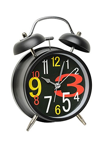 A2S Vintage Style Alarm Clock - Twin Bell, Analog & Battery Operated - Great for Heavy Sleepers and Travel (Black - Colorful Numbers, Round Shape)