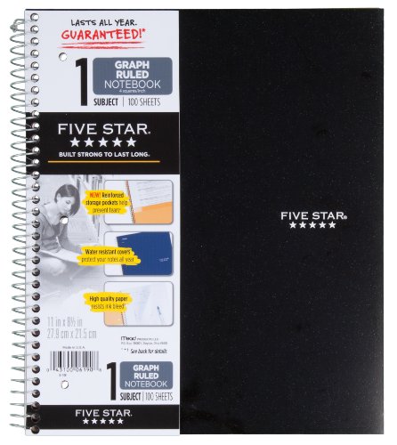 Five Star Spiral Notebook, 1 Subject, Graph Ruled, 100 Sheets, 11" x 8-1/2" Sheet Size, Assorted Colors (06190)