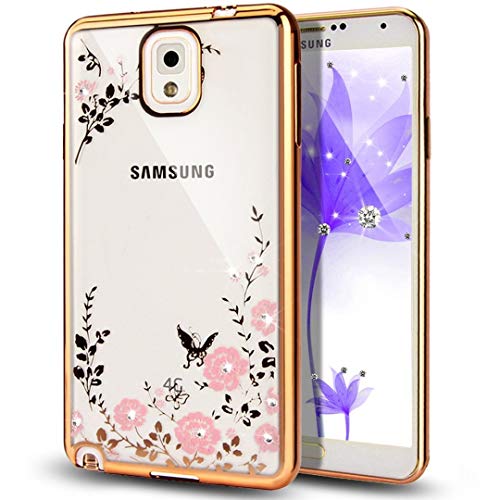 Galaxy Note 3 Case,NSSTAR Pink Butterfly Floral Flower Bling Crystal Rhinestone Diamonds Clear Rubber Rose Plating Frame Soft TPU Silicone GEL Protective Bumper Case Cover for Samsung Galaxy Note 3