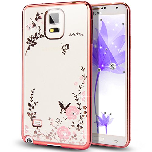 Galaxy Note 4 Case,NSSTAR Pink Butterfly Floral Flower Bling Crystal Rhinestone Diamonds Clear Rubber Rose Plating Frame Soft TPU Silicone GEL Protective Bumper Case Cover for Samsung Galaxy Note 4