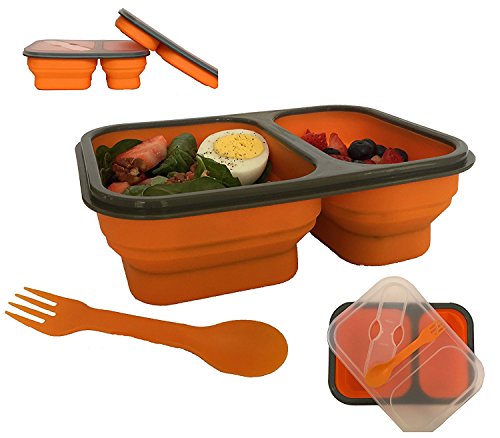 Silicone Collapsible Lunch Box, 2-Compartment, BPA Free, Microwave/Dishwasher Safe, Great for Kids and Adults (Orange)
