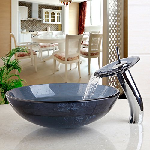 Yanksmart Tempered Glass Grey Bule Bath Vessel Sink And Mixer Faucet Tap Combo