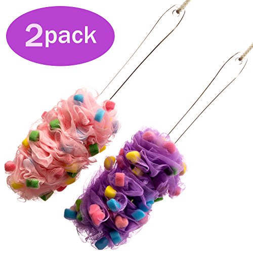 Bath Blossom Back Scrubber Brush (2 Pack) Loofah with Small Sponge and Mesh - Long Handled Shower Body Brush For Men and Women