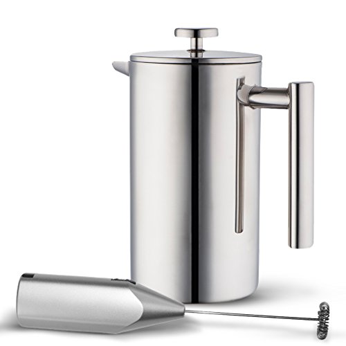Double Wall Tea & Coffee Brewer | Stainless Steel Coffee Pot & Maker - French Press 1 Liter 34 Oz Coffee Pot with Bonus Milk Frother | by MIRA