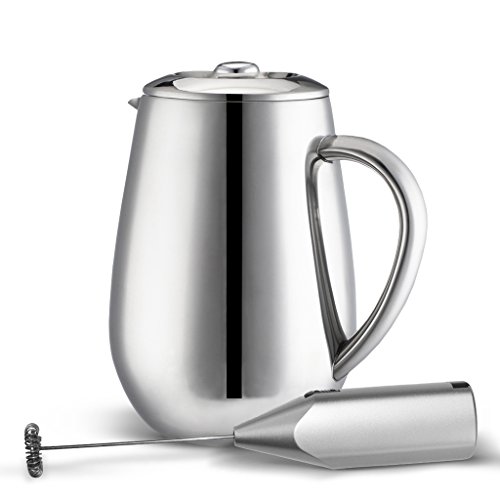 MIRA Double Wall Tea & Coffee Brewer French Press | Stainless Steel Insulated Coffee Pot & Maker | Keeps Brewed Coffee or Tea Warm for Hours | BONUS Handheld Milk Frother | 34 Oz (1 Liter)