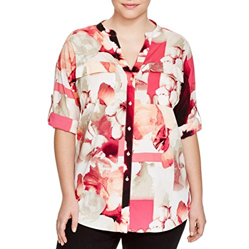 Calvin Klein Women's Plus Size Crew Neck Roll Sleeve Blouse, Hibiscus Multi CKSP, 1X