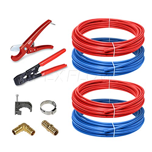 Pexflow PXKT1001234 Starter Kit with Crimper & Cutter Tools - Set includes Brass Elbow & Coupling Fittings, Cinch Clamps, Half Clamps, and 4 Rolls of 100ft PEX Tubing (2 of 1/2 inch and 2 of 3/4)