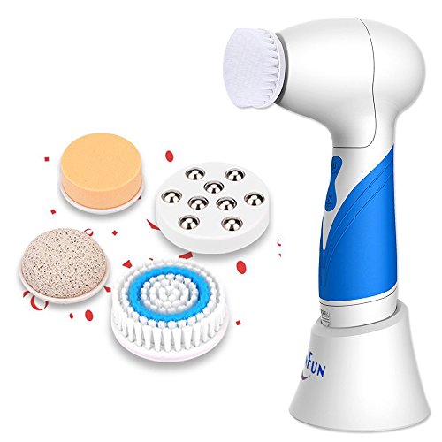 SKINFUN IPX7 Waterproof Facial Cleansing Brush Body and Face Scrubber Skin Microdermabrasion Exfoliator and Massager Bi-directional Rotation with 5 Brush Heads