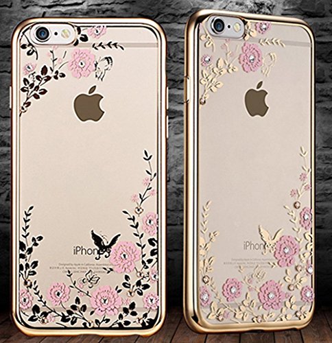 iPhone 6/6s Crystal TPU Secret Graden Flower Cover-Tikeda Fashion Transparent Soft TPU Case + Premium Hard PC Frame with Original Swarovski Element for iPhone 6/6s 4.7 Inch(Gold+Pink)