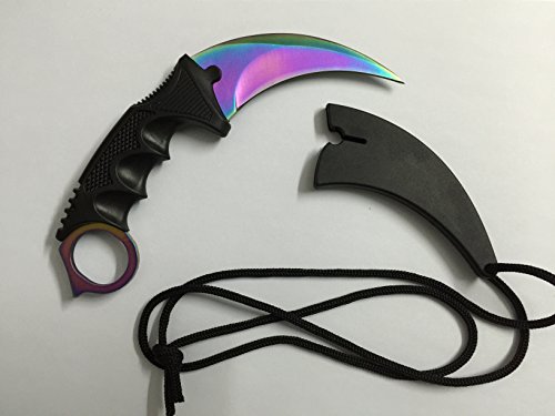 KAMISAFE Stainless Steel Rainbow Blade Outdoor Camping Hunting Climbing Survival Hawkbill Karambit Neck Knife with Rope(Color Titanium Knife)