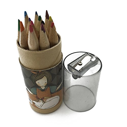 Mziart Mini Wooden Colored Pencils/ Drawing Pencils for Kids (Set of 12 Assorted Colors + 1 Sharpener, 3.5” Length, Black Lid)