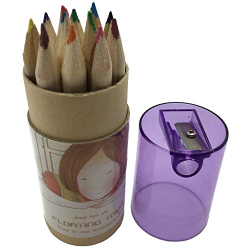 Mziart Mini Wooden Colored Pencils/ Drawing Pencils for Kids (Set of 12 Assorted Colors + 1 Sharpener, 3.5” Length, Purple Lid)