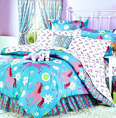 Girls Turquoise Blue & Pink Pony Horse Comforter Set W/Sheets (Bed in a Bag) (Full Size)