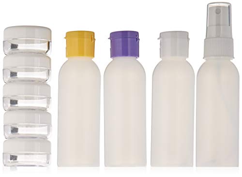 Moyo Natural Labs 9 Piece 2 Oz Premium HDPE travel bottle set and Travel Jars with Fine Mist Spray Bottle BPA Free Travel size bottle TSA Approved 2 oz travel Bottle Pack of 9 travel accessories