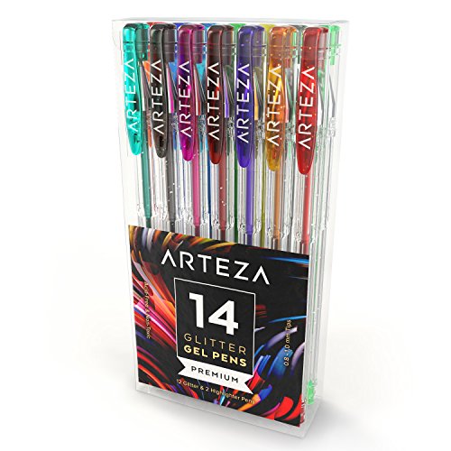 Arteza Glitter Gel Pens 14-Individual-Colors - Triangular Grip - (0.8-1.0 mm Tips, Set of 14)