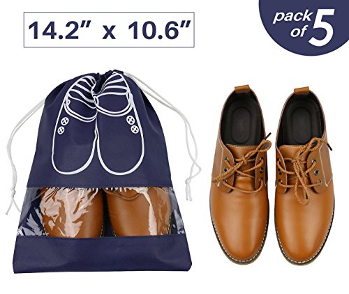 Portable Traveling Shoe Organizer Storage Bags with Draw String, View Window, Two Size & Colors, Cute & Durable , Pack of 5(Navy Blue L)