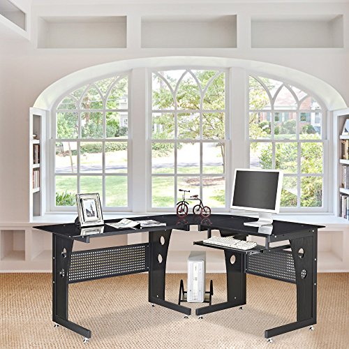 OGIMA Deluxe Modern L-Shaped Glasstop Office Workstation Computer Desk with Pull Out Keybaord Panel(Black)