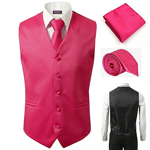3 Pcs Vest + Tie + Hot Pink Hankie Fashion Men's Formal Dress Suit Waistcoat