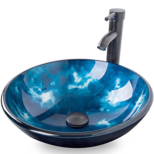 ELECWISH Bathroom Artistic Glass Vessel Sink Counter Top with Oil Rubbed Bronze Faucet and Pop-Up Drain Combo, Round