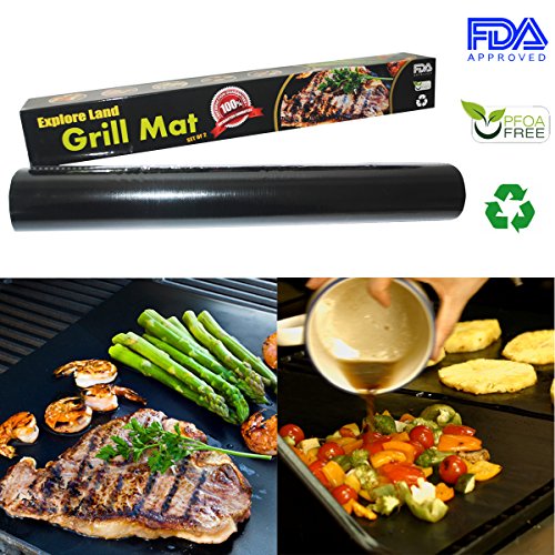 Explore Land BBQ Grill Mat - For Grilling and Baking - 100% Non Stick Oven Liner - 50% Thicker Heavy Duty - (Set of 2) - Reusable and Dishwasher Safe 15.75 x 13 Inches - 7 Year Warrenty