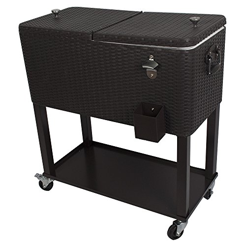 HIO 80 Qt Outdoor Patio Cooler Table On Wheels, with Shelf, Dark Brown Wicker