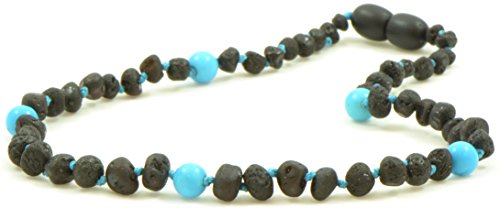 Unpolished Amber Teething Necklace with Turquoise Beads - 12.6 Inches - Baltic Amber Land - Raw Cherry Certified Baltic Amber Beads - Knotted - Screw Clasp