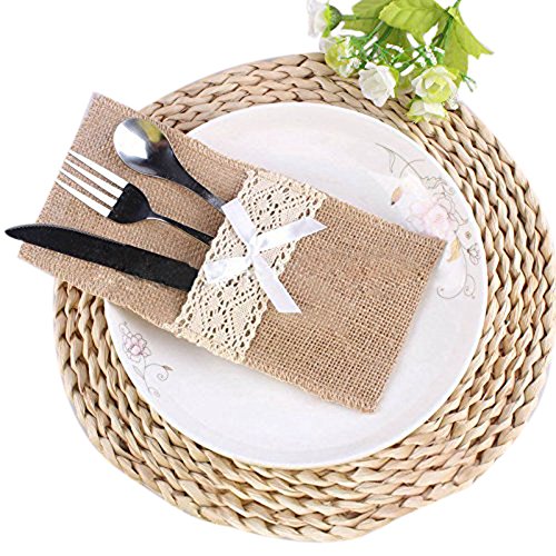 Ellen Tool Rustic Style Lace Bowknot Linen Silverware Holders with Rope Placemats, Nice home and kitchen Decor