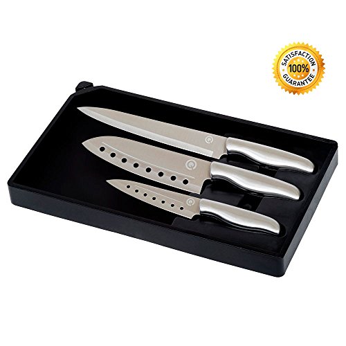 Kitchen Knife Set of 3 by QHP Includes 8 Inch Carving Knife 7 Inch Santoku Knife and 5 Inch Utility Knife Stainless Steel Blade Sharp Edge Smooth Silver Handle Packed in Black Box with Sharpener