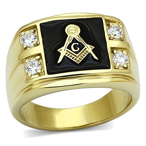 Men's 14k Gold Plated Masonic Free Mason Lodge Cz Black Square Ring Sizes 8,9,10,11,12 & 13