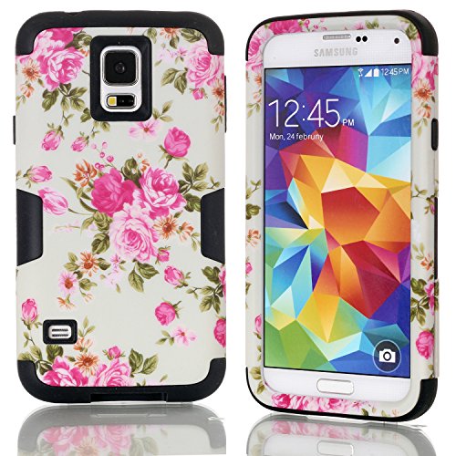 S5 Case, Firefish Beautiful Flower Design High Grade PC Combine With Soft Rubber No Slip With Durable Material Ultra Slim Skin For Samsung Galaxy S5 - Black Flower