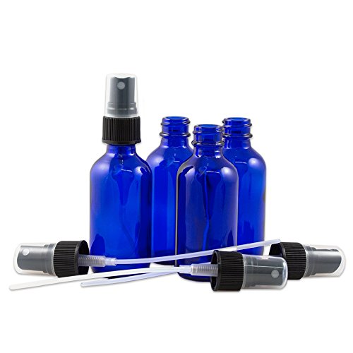 Pack of 4 - 2 Oz Cobalt Glass Spray Refillable Bottles - Black Fine Mist Sprayer Cover