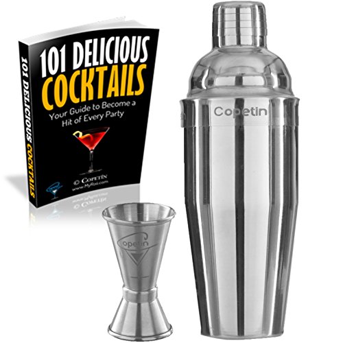 Cocktail Shaker Professional Stainless Steel by Copetín Bundle Set Martini Bar Kit 25oz Shaker & Built-in Strainer w/ BONUS Jigger & 101 Cocktail Recipes eBook