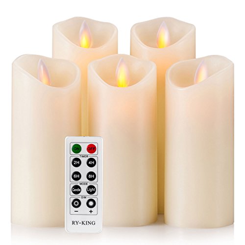 Ry-king 2.2" X 5"/6" Classic Pillar Real Wax Dancing Flameless LED Candles with Timer and 10-key Remote Control - Set of 5