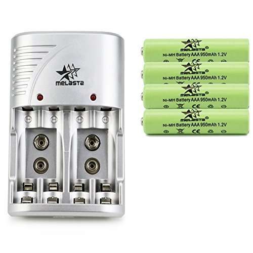 MELASTA Multifunctional 4 Solt Battery Charger AC 100-240V Charging US Plug AA/AAA / 9V Ni-MH/Ni-CD Wall Chargers + 4X 1.2V 950mAh NI-MH AAA Rechargeable Household Batteries