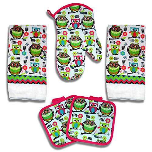 Kitchen Towel Set 5 Piece Towels Pot Holders Oven Mitt Decorative Design Everyday Use (5 Piece, Pink Owl)