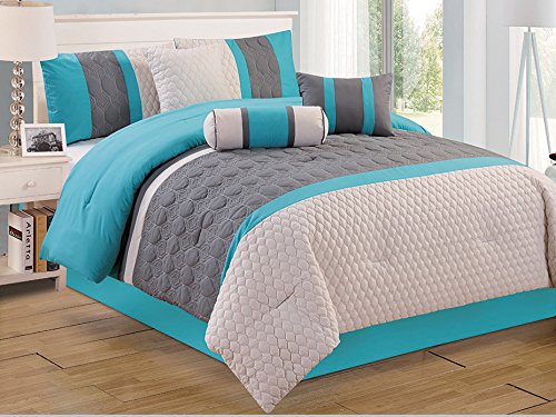 Modern 7 Piece Bedding Blue / Grey Embossed King Comforter Set with accent pillows