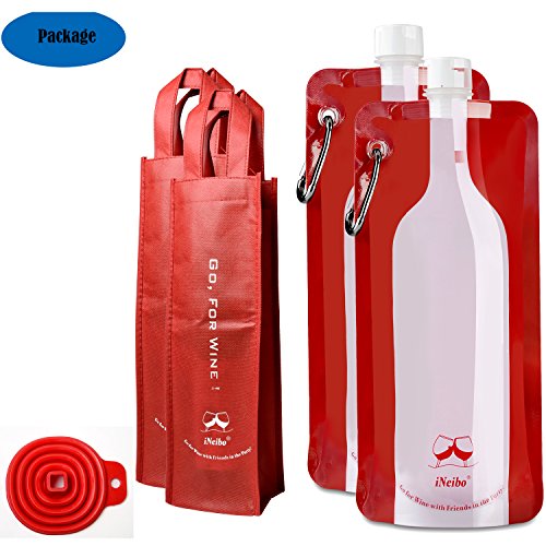 iNeibo Reusable Foldable ,Flexible, Wine Bag for Wine to Go 750ml - Includes Wine Bottle Carrying Case & Collapsible Filling Funnel ¡§C Bonus Climbing Hook and Reusable Wine Totes (2,Red)