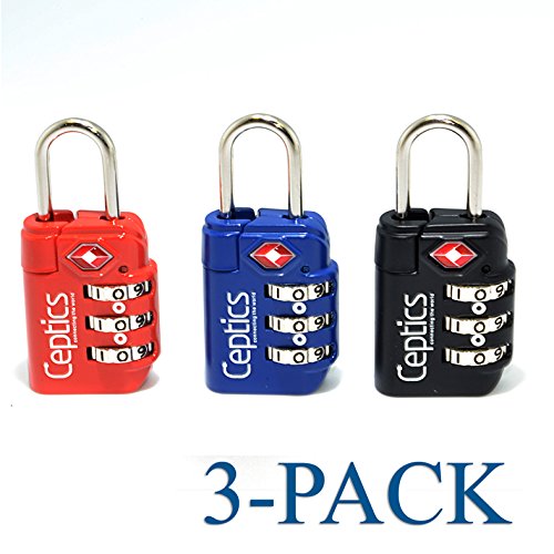 Ceptics 3 Pack Luggage Locks TSA Approved Travel Security Combination Padlocks - Black, Red, Blue