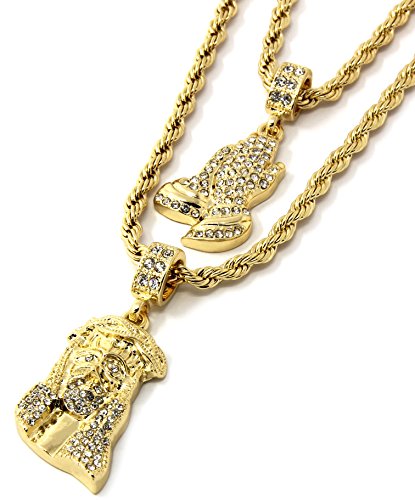 Jewel Town Mens Gold Two Piece Jesus & Prayer Hand Set Cz Pendant Hip Hop 24" & 30" Rope Chain D217