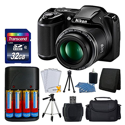 Nikon COOLPIX L340 20MP Digital Camera (Black) + AA Batteries & Charger + Transcend 32GB SDHC Memory Card + 50" Quality Tripod - Full Value Bundle - International Version (No Warranty)