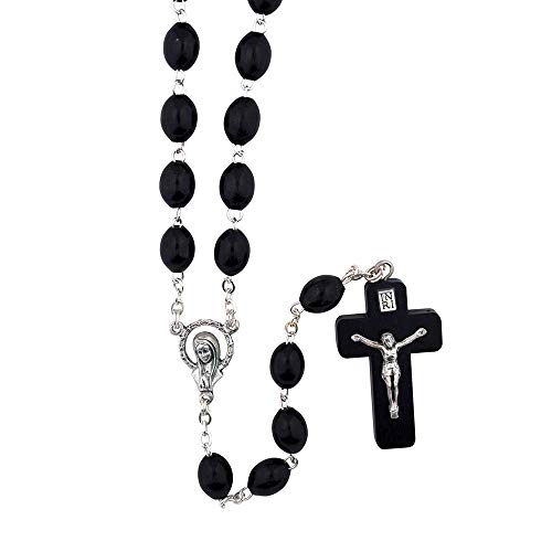 Black Wooden Rosary with Madonna Center Bead and Metal-Backed Crucifix