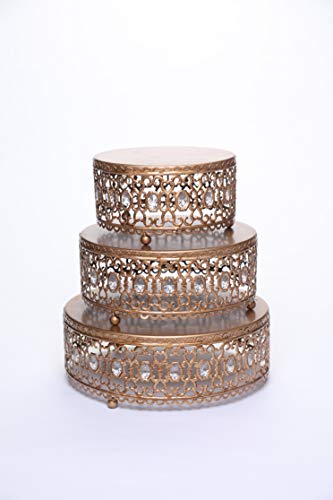 Opulent Treasures Set of 3 Riser Round Metal Cake Stands Clear Bead Decor (Bronze Gold)