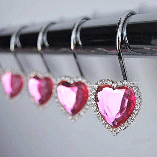 American Cuteness Shower Curtain Hooks Rings - Heart Pink Hot Fuchsia Decorative Crystal Diamond Bling Rhinestones Bathroom Bath Set Gift Valentine Girl (Pink Hot)
