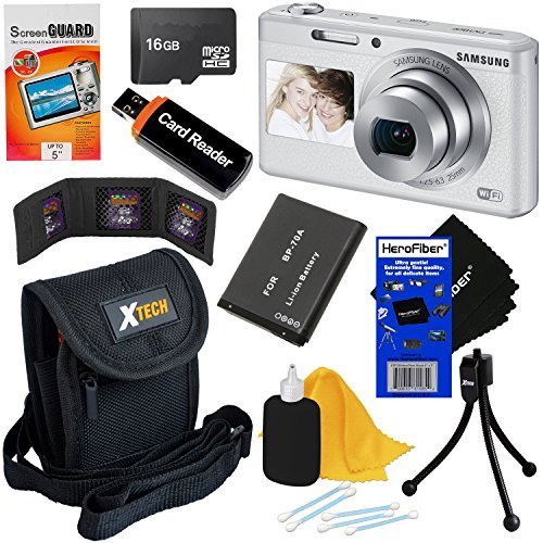 Samsung DV180F 16.2 MP Dual-View Wireless Smart Wi-Fi Digital Camera with 5x Zoom and 720p HD Video (White) + BP-70A Battery + 8pc Bundle 16GB Accessory Kit w/ HeroFiber Ultra Gentle Cleaning Cloth