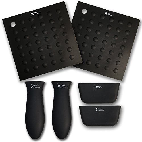 Kitchen Addiction 6 Piece Silicone Kitchen Set 2 Hot Handle Holder Sleeves, 2 Trivet/Potholder/Grippers, 2 Assist Handles Set (Black)