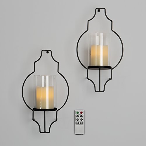 LampLust Flameless Candle Wall Sconces - Glass Hurricane Holders with Flickering LED Pillar Candles, Warm White Light, Black Metal Frame, Battery Operated, Remote Included, Set of 2