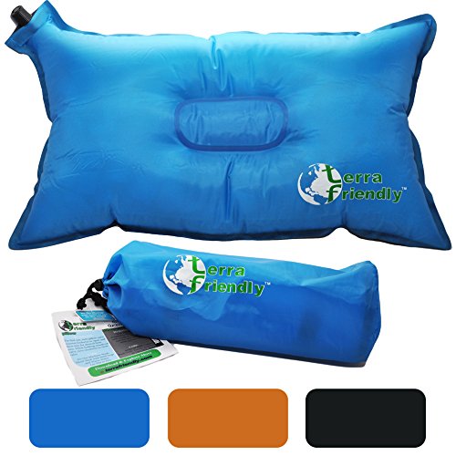 Premium Inflatable Air Pillow, Self Inflating Camping and Travel Pillow for Backpacking, Airplane, Beach and Beyond by Terra Friendly. 12" x 20" with Streamlined Stuff Pouch (Blue)