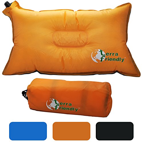Terra Friendly Self Inflating Air Camping Pillow - Inflatable Travel Pillow for Backpacking, Airplane, Beach and Beyond by 12" x 20" with Streamlined Stuff Pouch (Orange)