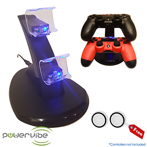 Dual Ps4 Charging Station By Powervibe - Playstation 4 Controller Charger Dock BUNDLE with LED Indicator - FREE PS4 Controller Grips