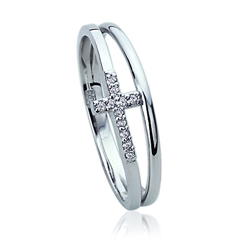 14K White Gold CZ Pave Double Band Sideway Cross Ring (Size 5 to 9)